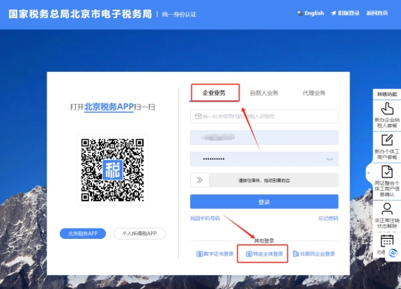 一、點(diǎn)擊【企業(yè)業(yè)務(wù)】—【特定主體登錄】。