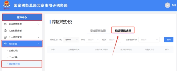 二、賬戶中心—身份切換—跨區(qū)域辦稅—稅源登記選擇,在此頁面選擇對應(yīng)的主管稅務(wù)機關(guān),點擊“切換”即可。