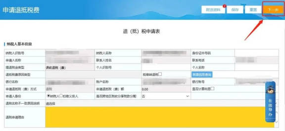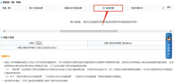 答:您好,請(qǐng)您在退稅頁(yè)面,往右側(cè)拖動(dòng)“退抵稅(費(fèi))明細(xì)”下方的滾動(dòng)條,后方會(huì)顯示標(biāo)黃的“本次退抵稅額”,填寫(xiě)此項(xiàng)信息后再點(diǎn)下一步提交即可。