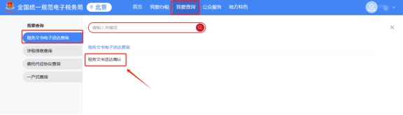 如果納稅人想查詢已送達(dá)的文書,點(diǎn)擊【我要查詢】—【稅務(wù)文書電子送達(dá)查詢】—【稅務(wù)文書送達(dá)確認(rèn)】。