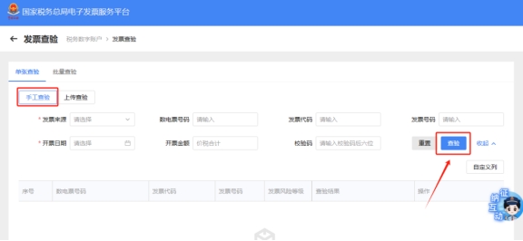 三、發(fā)票查驗(yàn)進(jìn)入查詢界面,選擇“手工查驗(yàn)”并按實(shí)際情況填寫相應(yīng)項(xiàng)目,點(diǎn)擊“查驗(yàn)”,系統(tǒng)會(huì)顯示對應(yīng)發(fā)票查驗(yàn)結(jié)果。