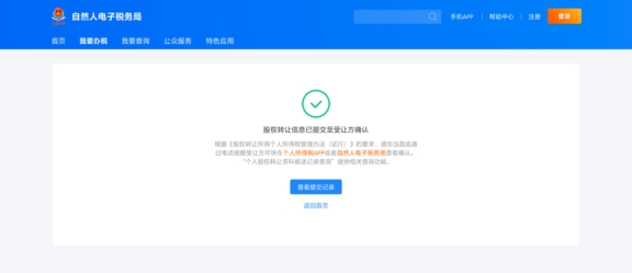 如果受讓方為自然人,需要其在個(gè)人所得稅APP或者自然人電子稅務(wù)局(WEB端)查看并確認(rèn)信息;如果受讓方是企業(yè),則需要其在扣繳客戶端或通過自然人電子稅務(wù)局網(wǎng)頁端扣繳功能查看并確認(rèn)信息。