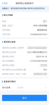 受讓方應(yīng)認(rèn)真核對股權(quán)轉(zhuǎn)讓信息,核對完成后選擇“核對結(jié)果”。若“核對無誤”則直接點(diǎn)擊“提交”,若選擇“核對有誤”則應(yīng)填寫相應(yīng)原因后點(diǎn)擊“提交”。對于受讓方確認(rèn)不通過的,納稅人需根據(jù)受讓方反饋信息進(jìn)行修改,并重新提交至受讓方確認(rèn);對于受讓方確認(rèn)通過的,會(huì)自動(dòng)轉(zhuǎn)入稅務(wù)機(jī)關(guān)受理審核環(huán)節(jié)。