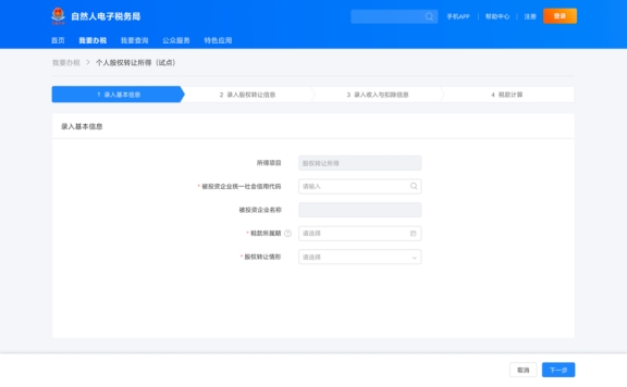 申報(bào)界面分為四個(gè)步驟,首先是錄入基本信息,在系統(tǒng)中錄入被投資企業(yè)統(tǒng)一社會(huì)信用代碼,選擇稅款所屬期、股權(quán)轉(zhuǎn)讓情形等。其次是錄入股權(quán)轉(zhuǎn)讓信息,該部分由“被投資企業(yè)信息”“股權(quán)轉(zhuǎn)讓方信息”“股權(quán)受讓方信息”及“附報(bào)資料”四部分組成,點(diǎn)擊“被投資企業(yè)信息”右側(cè)的“填寫”,進(jìn)入填寫頁面。