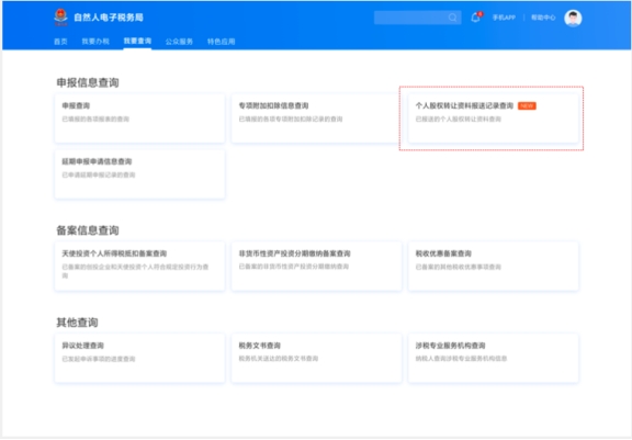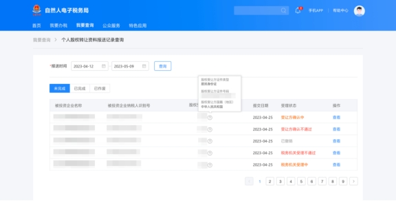 在自然人電子稅務(wù)局(WEB端)“我要查詢”——“個(gè)人股權(quán)轉(zhuǎn)讓資料報(bào)送記錄查詢”模塊可以查看主管稅務(wù)機(jī)關(guān)對股權(quán)轉(zhuǎn)讓材料的審核進(jìn)度。