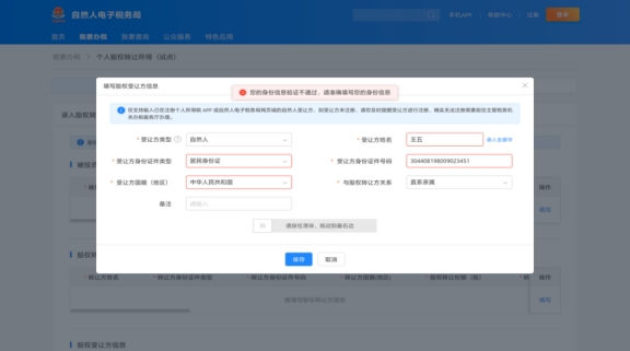 點(diǎn)擊“股權(quán)受讓方信息”右側(cè)的“填寫”,進(jìn)入填寫頁面。選擇受讓方類型,填報(bào)股權(quán)受讓方相關(guān)信息。這里需要注意的是,如果受讓方為自然人,需已實(shí)名注冊個(gè)人所得稅APP,如尚未注冊,需先行注冊后再辦理。填寫完成后點(diǎn)擊“保存”,轉(zhuǎn)入下一步操作。