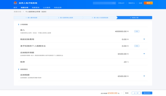 轉(zhuǎn)讓方申報(bào)的最后一個(gè)步驟,系統(tǒng)會(huì)自動(dòng)根據(jù)前三步的填報(bào)數(shù)據(jù),展示本次轉(zhuǎn)讓的計(jì)稅明細(xì)及需要繳納的個(gè)人所得稅。確認(rèn)無誤后點(diǎn)擊“提交資料”,股權(quán)轉(zhuǎn)讓信息就會(huì)提交至受讓方進(jìn)行核對。