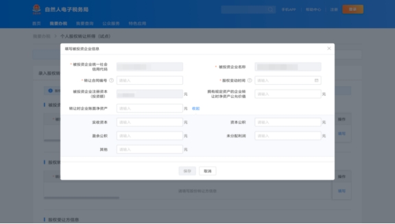填寫轉(zhuǎn)讓合同編號(hào)、股權(quán)變動(dòng)時(shí)間以及企業(yè)凈資產(chǎn)、實(shí)收資本、未分配利潤等相關(guān)信息。填寫完成后點(diǎn)擊“保存”,轉(zhuǎn)入下一步操作。