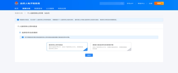 選擇“股權(quán)轉(zhuǎn)讓資料報(bào)送”,點(diǎn)擊“確定”。