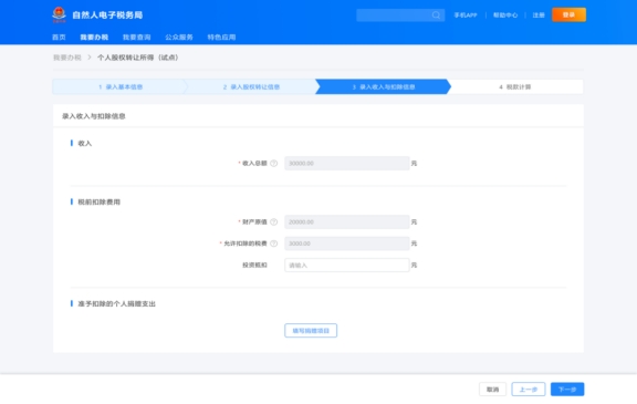 在錄入收入和扣除信息模塊,查看和錄入收入、稅前扣除費(fèi)用、準(zhǔn)予扣除的個(gè)人捐贈(zèng)支出相關(guān)信息,核實(shí)無誤后點(diǎn)擊下一步。