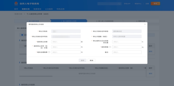 點(diǎn)擊“股權(quán)轉(zhuǎn)讓方信息”右側(cè)的“填寫”,進(jìn)入填寫頁面。填報(bào)股權(quán)轉(zhuǎn)讓份額、轉(zhuǎn)讓股權(quán)占企業(yè)總股份比重、股權(quán)轉(zhuǎn)讓合同價(jià)格、股權(quán)原值、相關(guān)合理稅費(fèi),填寫完成后點(diǎn)擊“保存”,轉(zhuǎn)入下一步操作。