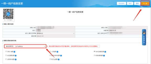 三、一照一碼戶(hù)登記信息變更頁(yè)面,在查詢(xún)變更項(xiàng)目后點(diǎn)擊下拉菜單,選擇生產(chǎn)經(jīng)營(yíng)地址,將變更后內(nèi)容填寫(xiě)完畢后點(diǎn)擊下一步提交即可。
