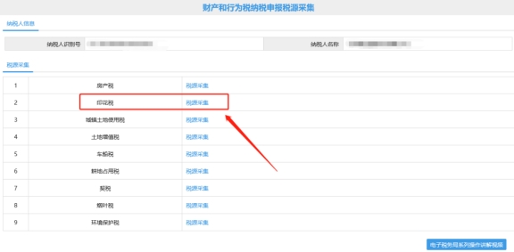 四、點擊“印花稅”稅種后方“稅源采集”按鈕進入查詢信息并修改。