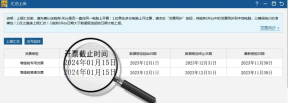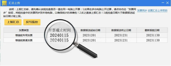 ●反寫監(jiān)控:申報(bào)成功后,點(diǎn)擊【數(shù)據(jù)管理】-【匯總上傳】-【反寫監(jiān)控】,開(kāi)票截止時(shí)間更新到2024年1月15日表示成功。