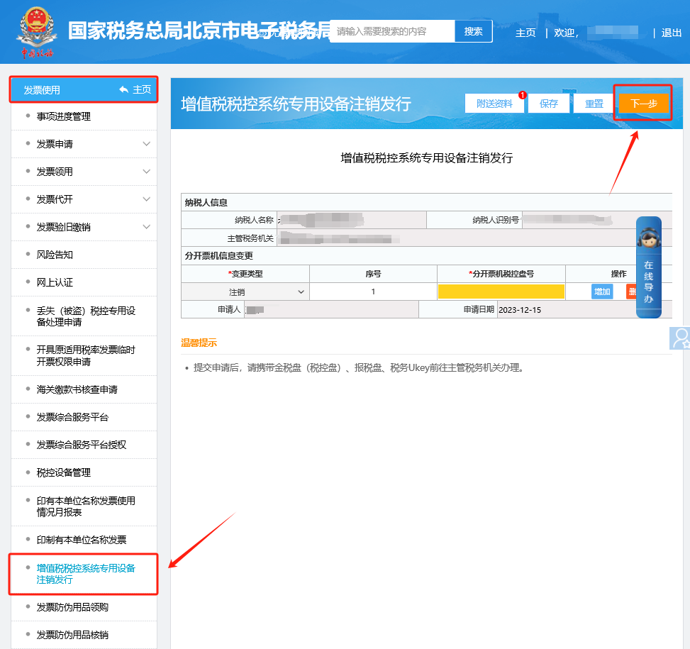 二、發(fā)票使用—增值稅稅控系統(tǒng)專用設(shè)備注銷發(fā)行,進(jìn)入即可展現(xiàn)填寫界面,請根據(jù)頁面信息填寫完畢并上傳附送資料信息,點擊下一步提交。