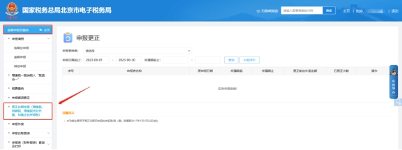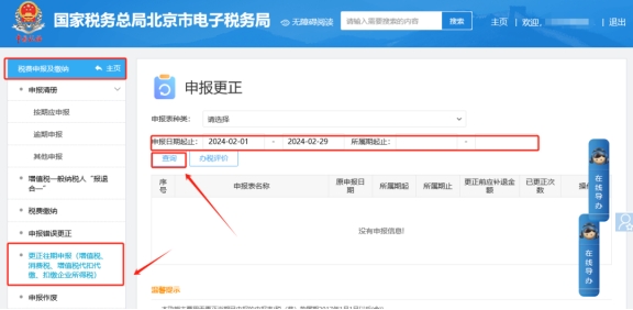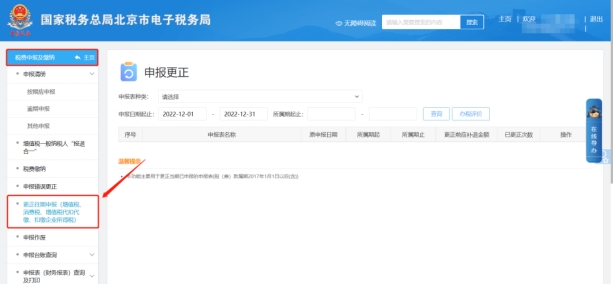 二、稅費申報及繳納,更正往期申報(增值稅、消費稅、增值稅代扣代繳、扣繳企業(yè)所得稅)模塊,根據(jù)查詢條件找到報表后點擊右側(cè)的“更正申報”按鈕進入表單完成修改及申報。