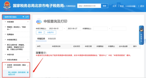 二、稅費申報及繳納—申報表(財務報表)查詢及打印—網(wǎng)上申報表(財務報表)查詢及打印模塊查詢更新后的報表信息即可。