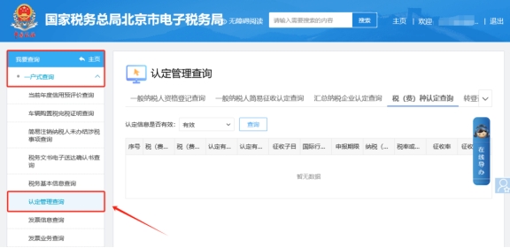 (2)請(qǐng)您點(diǎn)擊【我要查詢】—【一戶式查詢】—【認(rèn)定管理查詢】—【稅(費(fèi))種認(rèn)定查詢】,查詢條件選成全部查詢。
