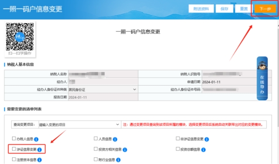 三、一照一碼戶登記信息變更頁面,選擇涉證信息查看是否帶出國標(biāo)行業(yè)項(xiàng),若帶出請點(diǎn)擊右上角下一步提交變更,變更之后重新提交跨區(qū)域涉稅事項(xiàng)報(bào)告即可。