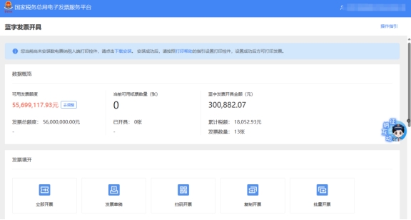 三、藍(lán)字發(fā)票開(kāi)具頁(yè)面,進(jìn)入后可以看到可用發(fā)票額度,這個(gè)額度就是您企業(yè)可開(kāi)的數(shù)電票總額度。