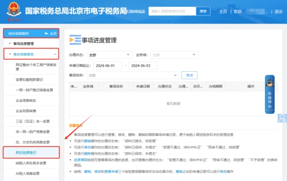 二、綜合信息報(bào)告—身份信息報(bào)告 — 跨區(qū)稅源登記,進(jìn)入后點(diǎn)擊“02 查詢經(jīng)營(yíng)項(xiàng)目地址及稅率”,在需要?jiǎng)h除的項(xiàng)目地址后方操作下方點(diǎn)擊【刪除】即可。