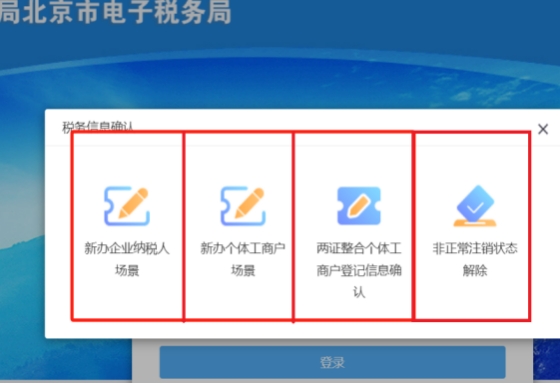 使用舊版登錄時(shí)在登錄界面窗口有“ 稅務(wù)信息確認(rèn) ”按鈕,點(diǎn)擊后,涵蓋“ 新辦企業(yè)納稅人場景 ”“ 新 辦 個(gè)體戶場景 ”“ 兩證整合個(gè)體工商戶登記信息確認(rèn) ”“ 非正常注銷狀態(tài)解除 ”。