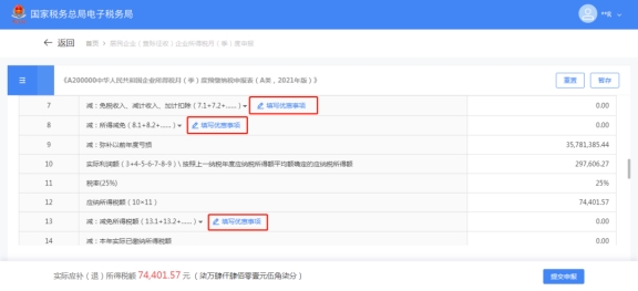 ?、廴艏{稅人存在免稅收入、減計收入、加計扣除、所得減免或減免所得稅額情形,可點(diǎn)擊主表第7、8、13欄的“填寫優(yōu)惠事項(xiàng)”按鈕,彈出對應(yīng)界面進(jìn)行勾選和填寫。