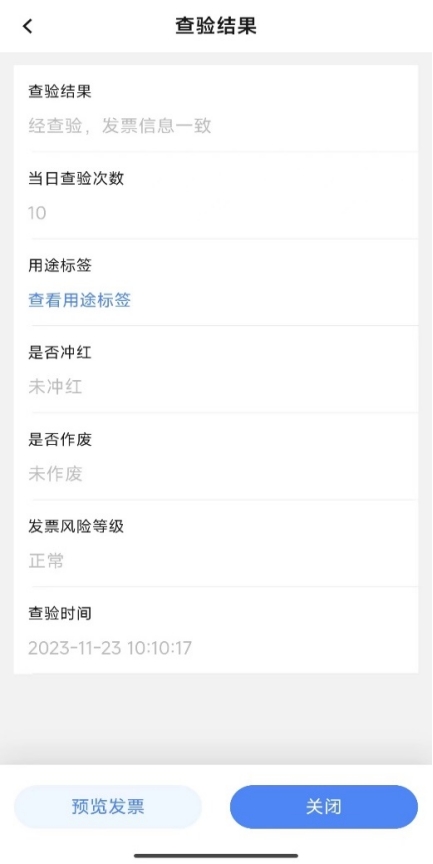 查驗(yàn)本人發(fā)票,且結(jié)果一致時(shí),反饋查驗(yàn)結(jié)果“經(jīng)查驗(yàn),發(fā)票信息一致”,同時(shí)展示發(fā)票票面信息、發(fā)票標(biāo)簽信息(包括發(fā)票用途標(biāo)簽及紅字發(fā)票標(biāo)簽等)及發(fā)票查驗(yàn)時(shí)間等信息;點(diǎn)擊【預(yù)覽發(fā)票】可以預(yù)覽發(fā)票的票面。查詢(xún)結(jié)果不一致的,反饋結(jié)果“經(jīng)查驗(yàn),發(fā)票信息不一致”,查驗(yàn)結(jié)果為不一致時(shí)不可預(yù)覽發(fā)票。若未查到該發(fā)票信息,反饋結(jié)果為“未查詢(xún)到該發(fā)票信息”。