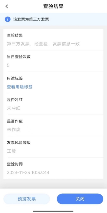 查驗(yàn)第三方發(fā)票時(shí),查驗(yàn)結(jié)果一致的反饋提示“第三方發(fā)票,經(jīng)查驗(yàn),發(fā)票信息一致”,查驗(yàn)結(jié)果一致時(shí)可點(diǎn)擊【預(yù)覽發(fā)票】查看發(fā)票票面信息;結(jié)果不一致的反饋提示“第三方發(fā)票,經(jīng)查驗(yàn),發(fā)票信息不一致”,查驗(yàn)結(jié)果不一致時(shí)不可預(yù)覽發(fā)票;若未查到,系統(tǒng)反饋“第三方發(fā)票,未查詢(xún)到該發(fā)票信息”。