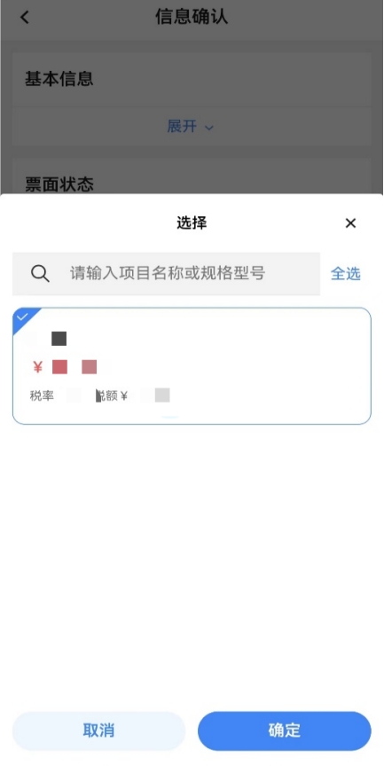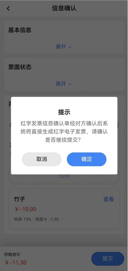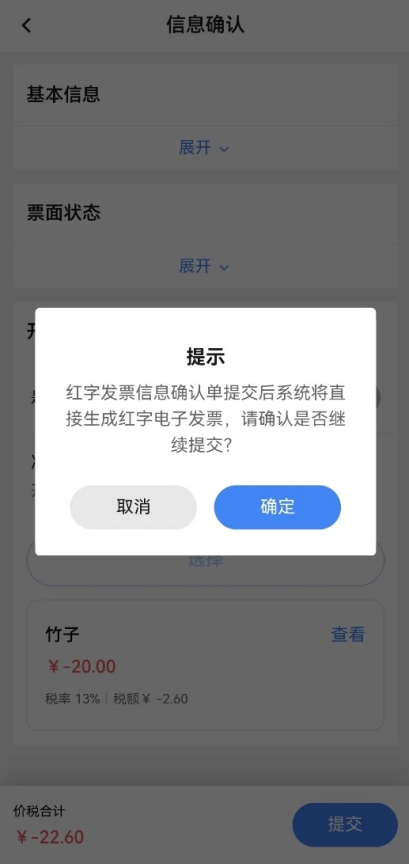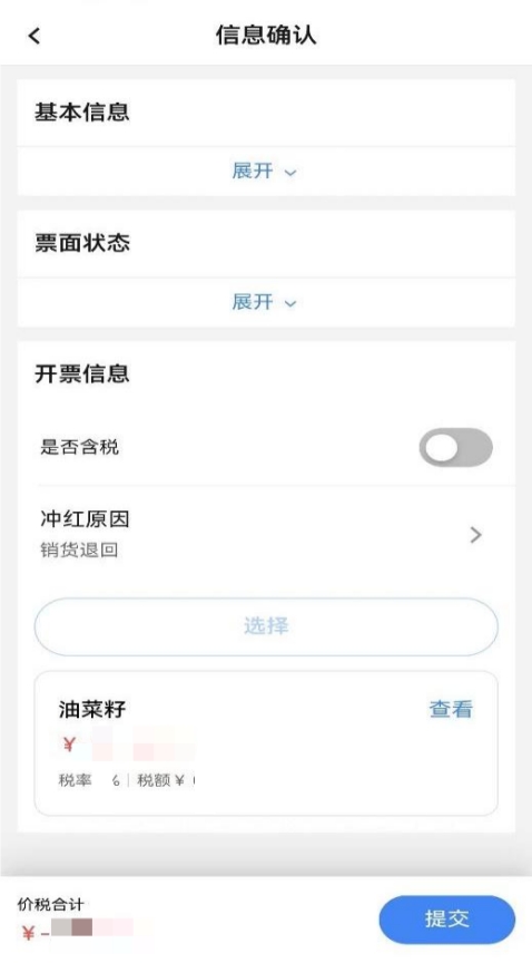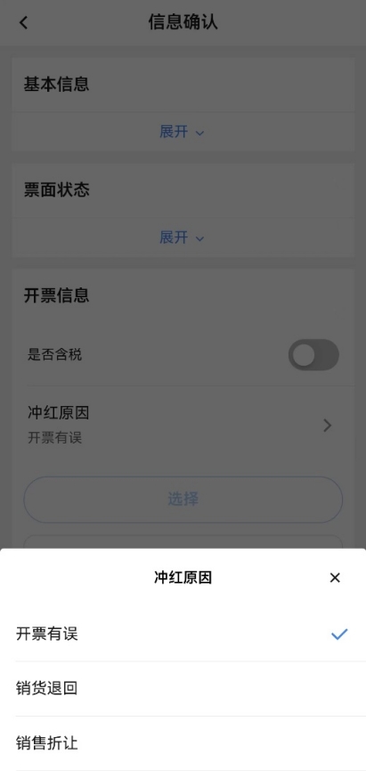 納稅人點(diǎn)擊要紅沖的藍(lán)字發(fā)票,進(jìn)入“信息確認(rèn)”頁(yè)面,此頁(yè)面從上至下可分為基本信息、票面狀態(tài)、開票信息??赏ㄟ^(guò)點(diǎn)擊【展開】下拉按鈕查看購(gòu)銷雙方基本信息和藍(lán)字發(fā)票的一些票面信息和藍(lán)字發(fā)票狀態(tài)等信息。開票信息中可通過(guò)點(diǎn)擊【紅沖原因】選擇具體的紅沖原因,下方顯示可紅沖的項(xiàng)目信息。點(diǎn)擊【查看】按鈕可顯示可紅沖項(xiàng)目的規(guī)格型號(hào)、數(shù)量、金額等具體信息。