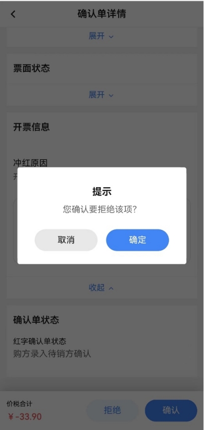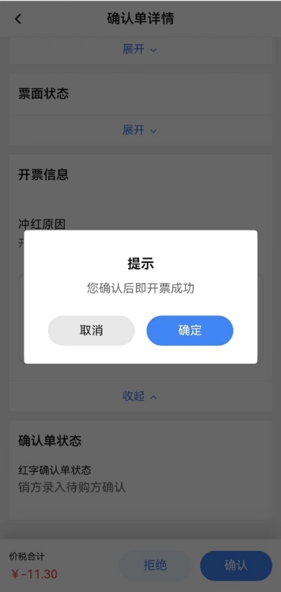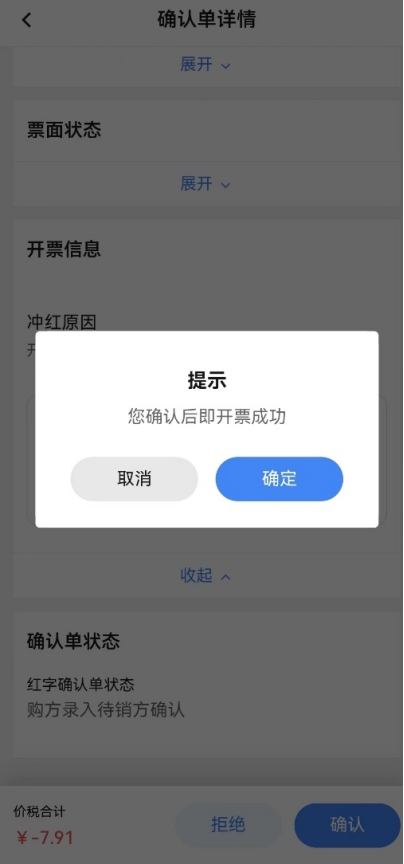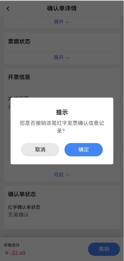 選擇需要處理的紅字信息確認(rèn)單,點(diǎn)擊后進(jìn)入“確認(rèn)單詳情”頁(yè)面。無(wú)需確認(rèn)的情況下銷方在紅字發(fā)票未開具前,點(diǎn)擊【撤銷】彈出撤銷提示,點(diǎn)擊【確定】成功撤銷此紅字信息確認(rèn)單。需要雙方確認(rèn)的場(chǎng)景發(fā)起方在對(duì)方未確認(rèn)前,點(diǎn)擊【拒絕】彈出撤銷提示,點(diǎn)擊【確定】成功撤銷此紅字信息確認(rèn)單。