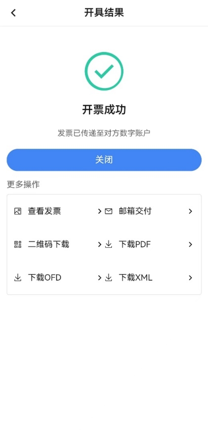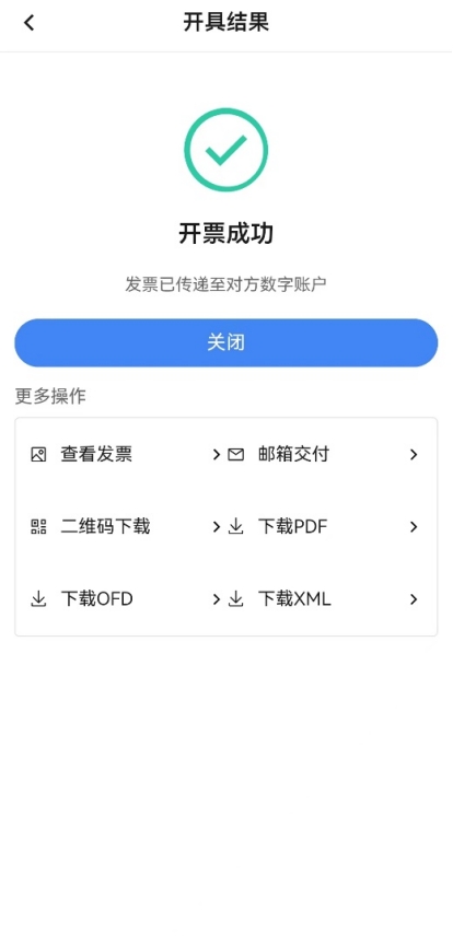 打開的確認(rèn)單狀態(tài)為“購(gòu)方錄入待銷方確認(rèn)”時(shí),點(diǎn)擊【確認(rèn)】,彈出確認(rèn)即開票提示,點(diǎn)擊【確定】,紅字發(fā)票開具成功,跳轉(zhuǎn)到“開具結(jié)果”頁(yè)面,此頁(yè)面可查看開具的紅字發(fā)票,同時(shí)展示各個(gè)發(fā)票交付渠道,可按各渠道按鈕點(diǎn)擊后進(jìn)行相應(yīng)交付。