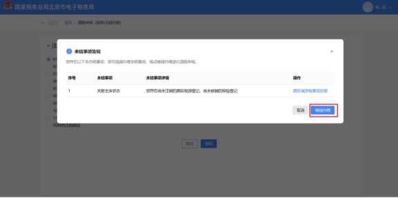?、傧到y(tǒng)彈出未結(jié)事項(xiàng)告知界面,系統(tǒng)提示“您存在以下未辦結(jié)事項(xiàng):您可選擇辦理未結(jié)事項(xiàng),辦理完結(jié)后點(diǎn)擊刷新,繼續(xù)進(jìn)行清稅申報(bào)?!?,展示未結(jié)事項(xiàng)以及對(duì)應(yīng)辦理鏈接按鈕,點(diǎn)擊【繼續(xù)辦理】。