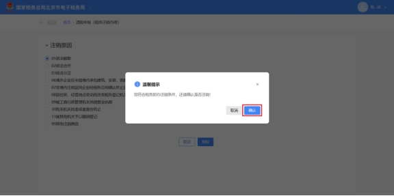 1)系統(tǒng)提示“尊敬的納稅人:您符合稅務(wù)即辦注銷條件,確認(rèn)是否注銷!”,點(diǎn)擊【確定】。