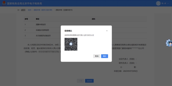 c.彈出二維碼認(rèn)證窗口,系統(tǒng)提示“選擇承諾制需要法定代表人進(jìn)行實(shí)名認(rèn)證”,使用“電子稅務(wù)局app”進(jìn)行掃碼認(rèn)證,點(diǎn)擊【確定】。