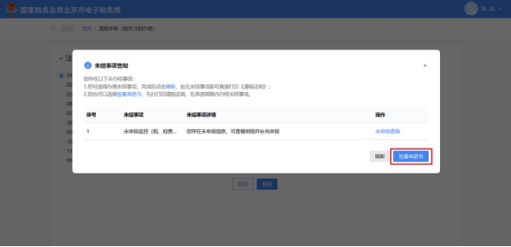 ①?gòu)棾鑫唇Y(jié)事項(xiàng)告知界面,系統(tǒng)提示“您存在以下未辦結(jié)事項(xiàng):您可選擇辦理未結(jié)事項(xiàng),辦理完結(jié)后點(diǎn)擊刷新,繼續(xù)進(jìn)行清稅申報(bào)?!?,展示未結(jié)事項(xiàng)以及對(duì)應(yīng)辦理鏈接按鈕,點(diǎn)擊【繼續(xù)辦理】。