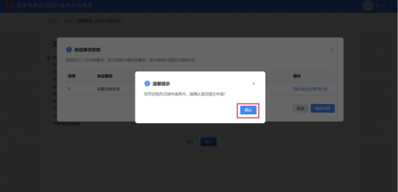 ?、谙到y(tǒng)提示“尊敬的納稅人:您符合稅務(wù)注銷申請(qǐng)條件,確認(rèn)是否提交申請(qǐng)!”,點(diǎn)擊【確認(rèn)】。