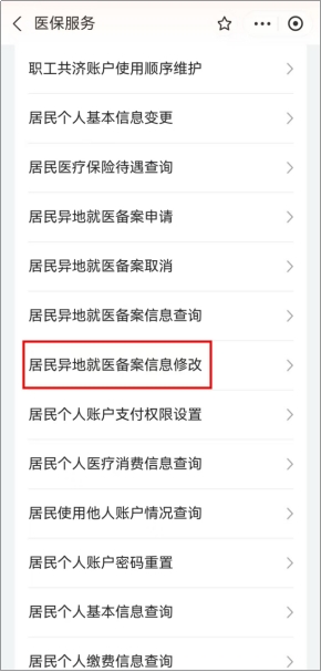 2、請點擊【修改居民異地就醫(yī)備案信息】。