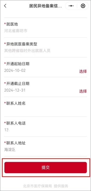 3、請修改備案的起止時間、聯(lián)系人姓名、聯(lián)系電話和聯(lián)系地址等信息,然后點擊【提交】。